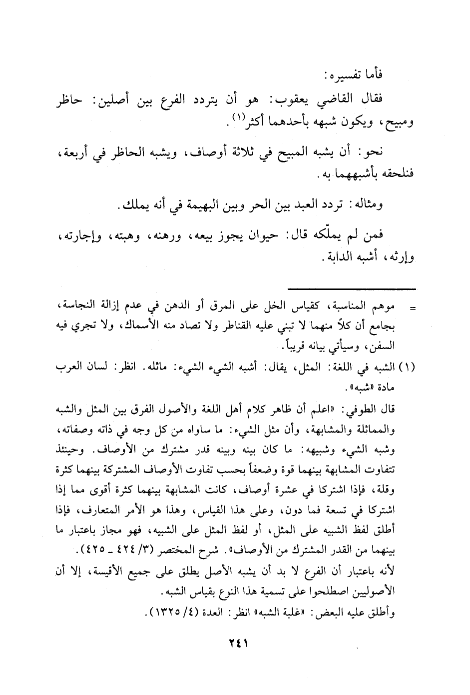 قال الطوفي: "اعلم أن ظاهر كلام أهل اللغة والأصول الفرق بين المثل والشبه والمماثلة والمشابهة، وأن مثل الشيء: ما ساواه من كل وجه في ذاته وصفاته وشبه، الشيء وشبيهه: ما كان بينه وبينه قدر مشترك من الأوصاف. وحينئذ تتفاوت المشاهبة بينهما قوة وضعفًا بحسب تفاوت الأوصاف المشتركة بينهما كثرة وقلة، فإذا اشتركا في عشرة أوصاف، كانت المشابهة بينهما كثرة أقوى مما إذا اشتركا في تسعة فما دون، وعلى هذا القياس، وهذا هو الأمر المتعارف، فإذا أطلق لفظ الشبيه على المثل، أو لفظ المثل على الشبيه، فهو مجاز باعتبار ما بينهما من القدر المشترك من الأوصاف". شرح المختصر "3/ 424-425".