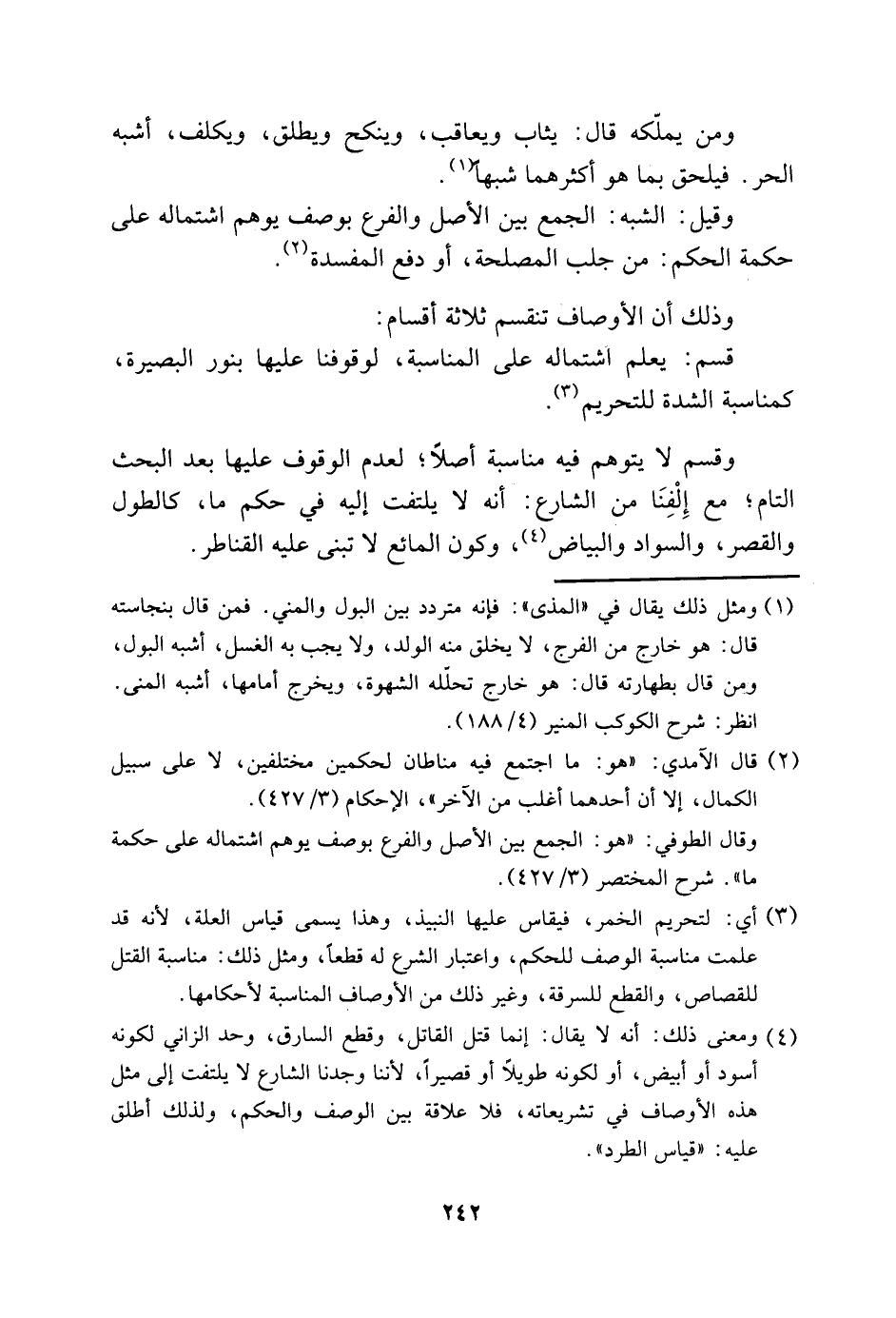 وقسم لا يتوهم فيه مناسبة أصلًا، لعدم الوقوف عليها بعد البحث التام، مع إِلْفِنَا من الشارع: أنه لا يلتفت إليه في حكم ما، كالطول والقصر، والسواد والبياض4، وكون المائع لا تبنى عليه القناطر.