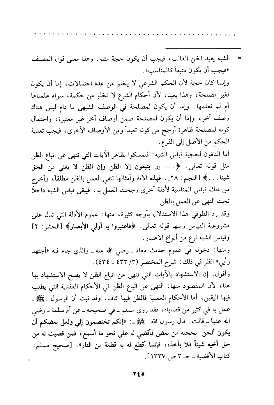وأقول إن الاستشهاد بالآيات التي تنهى عن اتباع الظن لا يصح الاستشهاد بها هنا؛ لأن المقصود منها: النهي عن اتباع الظن في الأحكام العقدية التي يطلب فيها اليقين، أما الأحكام العملية فالظن فيها كاف، وقد ثبت أن الرسول الله -صَلّى الله عَلَيْهِ وَسَلّم- عمل به في كثير من قضاياه، فقد روى مسلم -في صحيحه- عن أم سلمة -رضي الله عنها- قالت: قال رسول الله، صَلّى الله عَلَيْهِ وَسَلّم: "إنكم تختصمون إليّ، ولعل بعضكم أن يكون ألحن بحجته من بعض فأقضي له على نحو ما أسمع، فمن قضيت له من حق أخيه شيئًا فلا يأخذه، فإنما أقطع له به قطعة من النار". [صحيح مسلم: كتاب الأفضية. جـ3 ص1337] .