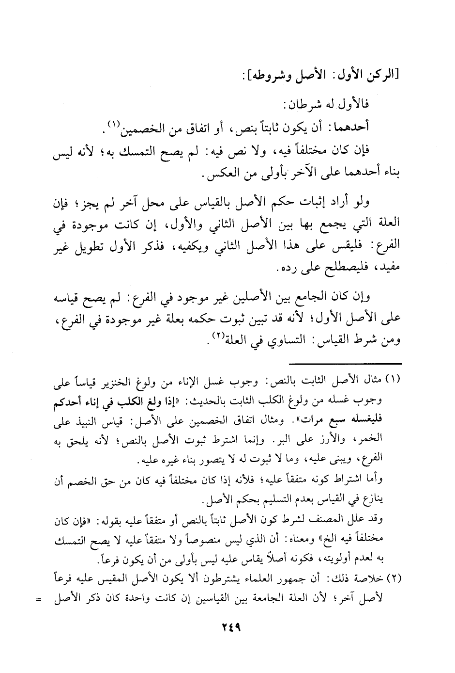 1 مثال الأصل الثابت بالنص: وجوب غسل الإناء من ولوغ الخنزير قياسًا على وجوب غسله من ولوغ الكلب الثابت بالحديث: "إذا ولغ الكلب في إناء أحدكم فليغسله سبع مرات". ومثال اتفاق الخصمين على الأصل: قياس النبيذ على الخمر، والأرز على البر. وإنما اشترط ثبوت الأصل بالنص؛ لأنه يلحق به الفرع، ويبنى عليه، وما لا ثبوت له لا يتصور بناء غيره عليه.
