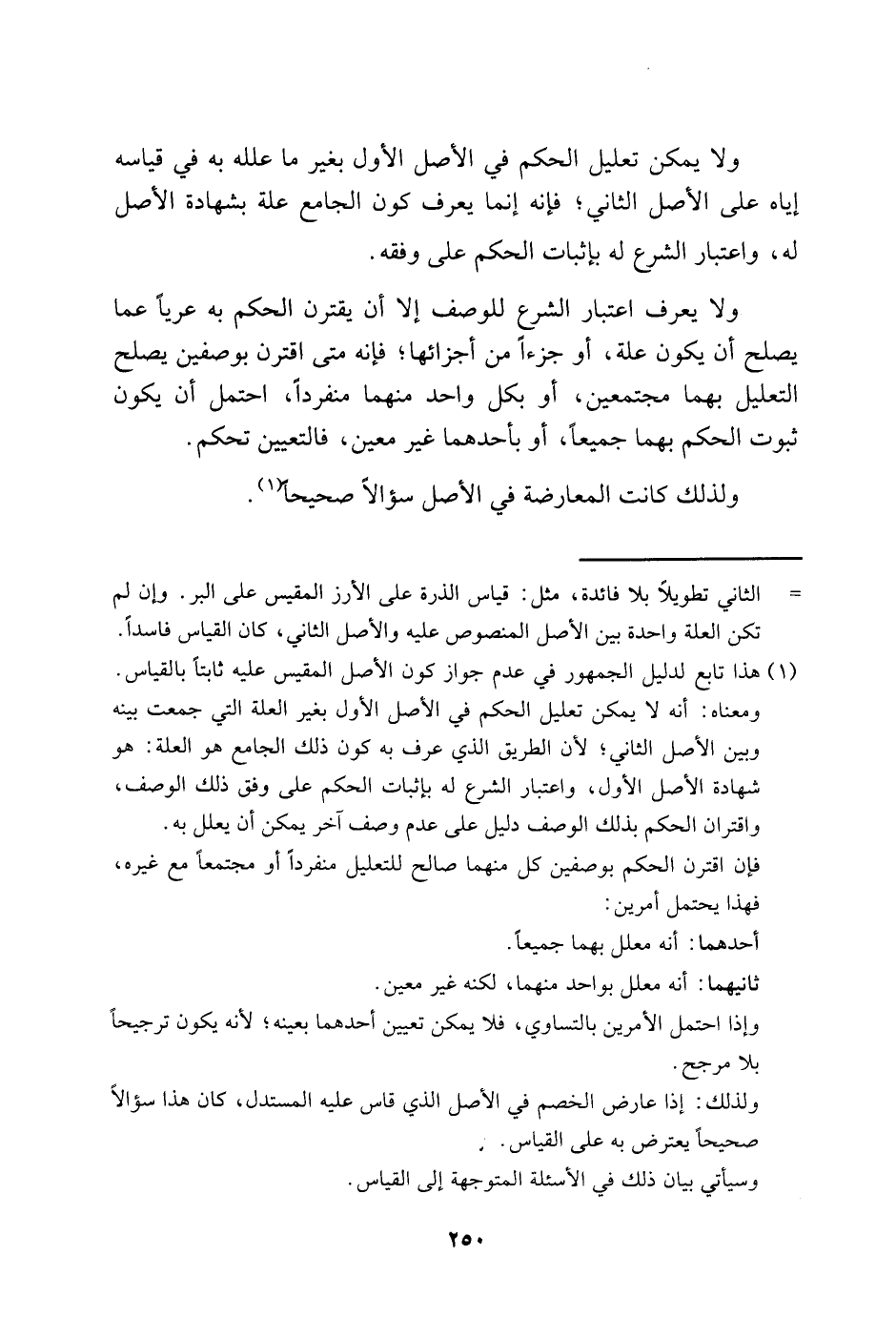 1 هذا تابع لدليل الجمهور في عدم جواز كون الأصل المقيس عليه ثابتًا بالقياس. ومعناه: أنه لا يمكن تعليل الحكم في الأصل الأول بغير العلة التي جمعت بينه وبين الأصل الثاني؛ لأن الطريق الذي عرف به كون ذلك الجامع هو العلة: هو شهادة الأصل الأول، واعتبار الشرع له بإثبات الحكم على وفق ذلك الوصف، واقتران الحكم بذلك الوصف دليل على عدم وصف آخر يمكن أن يعلل به.