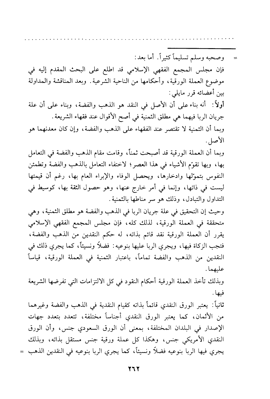 فإن مجلس المجمع الفقهي الإسلامي قد اطلع على البحث المقدم إليه في موضوع العلة الورقية، وأحكامها من الناحية الشرعية، وبعد المناقشة والمداولة بين أعضائه قرر ما يلي: