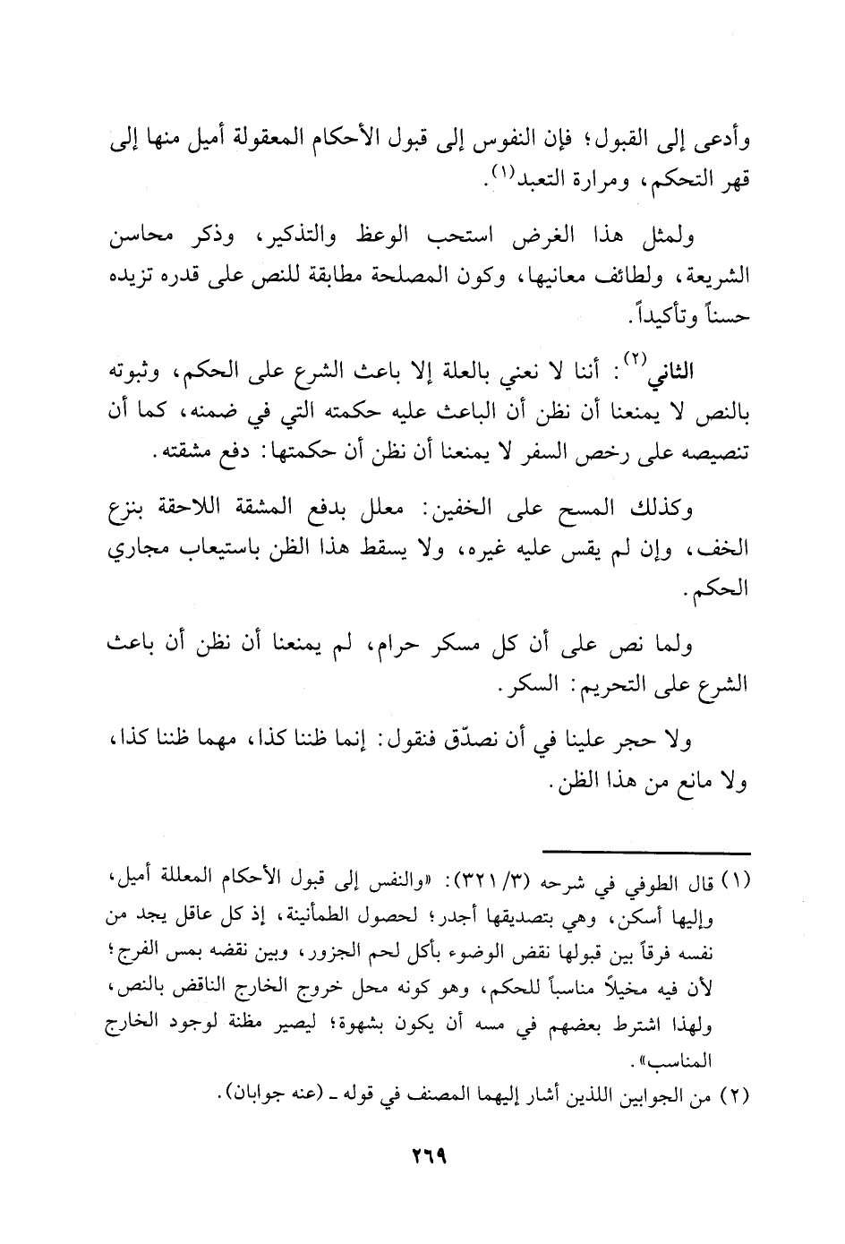 1 قال الطوفي في شرحه "3/ 321": "والنفس إلى قبول الأحكام المعللة أميل، وإليها أسكن، وهي بتصديقها أجدر، لحصول الطمأنينة، إذ كل عاقل يجد من نفسه فرقًا بين قبولها نقض الوضوء بأكل لحم الجزور، وبين نقضه بمس الفرج؛ لأن فيه مخيلًا مناسبًا للحكم، وهو كونه محل خروج الخارج الناقض بالنص، ولهذا اشترط بعضهم في مسه أن يكون بشهوة، ليصير مظنة لوجود الخارج المناسب".