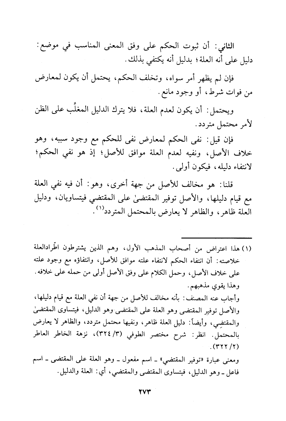 وأجاب عنه المصنف: بأنه مخالف للأصل من جهة أن نفي العلة مع قيام دليلها، والأصل توفير المقتضى وهو العلة على المقتضي وهو الدليل، فيتساوى المقتضى والمقتضي، وأيضًا: دليل العلة ظهر، ونفيها محتمل متردد، والظاهر لا يعارض بالمحتمل. انظر: شرح مختصر الطوفي "3/ 324"، نزهة الخاطر العاطر "2/ 322".