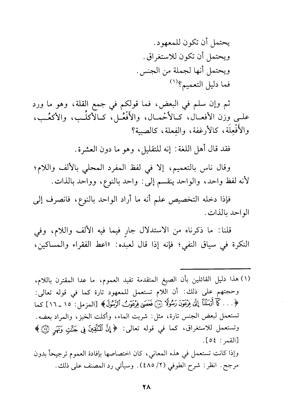 1 هذا دليل القائلين بأن الصيغ المتقدمة تفيد العموم، ما عدا المقترن باللام، وحجتهم على ذلك: أن اللام تستعمل للمعهود تارة كما في قوله تعالى: { ... كَمَا أَرْسَلْنَا إِلَى فِرْعَوْنَ رَسُولًا، فَعَصَى فِرْعَوْنُ الرَّسُولَ} [المزمل: 15-16] كما تستعمل لبعض الجنس تارة، مثل: شربت الماء، وأكلت الخبز، والمراد بعضه. وتستعمل للاستغراق، كما في قوله تعالى: {إِنَّ الْمُتَّقِينَ فِي جَنَّاتٍ وَنَهَر} [القمر: 54] .