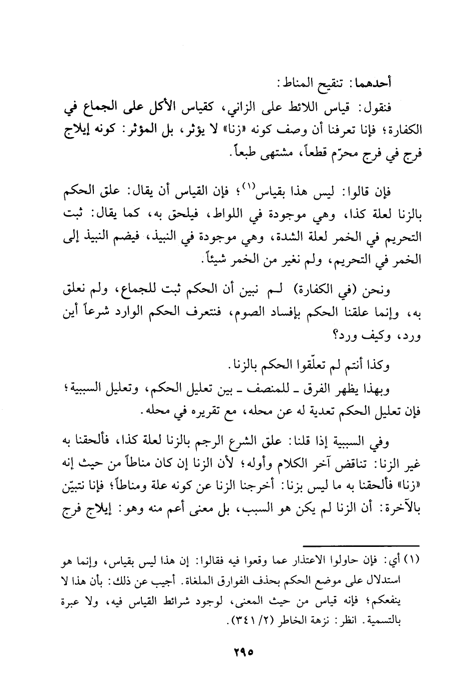 وفي السببية إذا قلنا: علق الشرع الرجم بالزنا لعلة كذا، فألحقنا به غير الزنا: تناقض آخر الكلام وأوله؛ لأن الزنا إن كان مناطًا من حيث إنه "زنا" فألحقنا به ما ليس بزنا: أخرجنا الزنا عن كونه علة ومناطًا، فإنا نتبيّن بالآخرة: أن الزنا لم يكن هو السبب، بل معنى أعم منه وهو: إيلاج فرج.