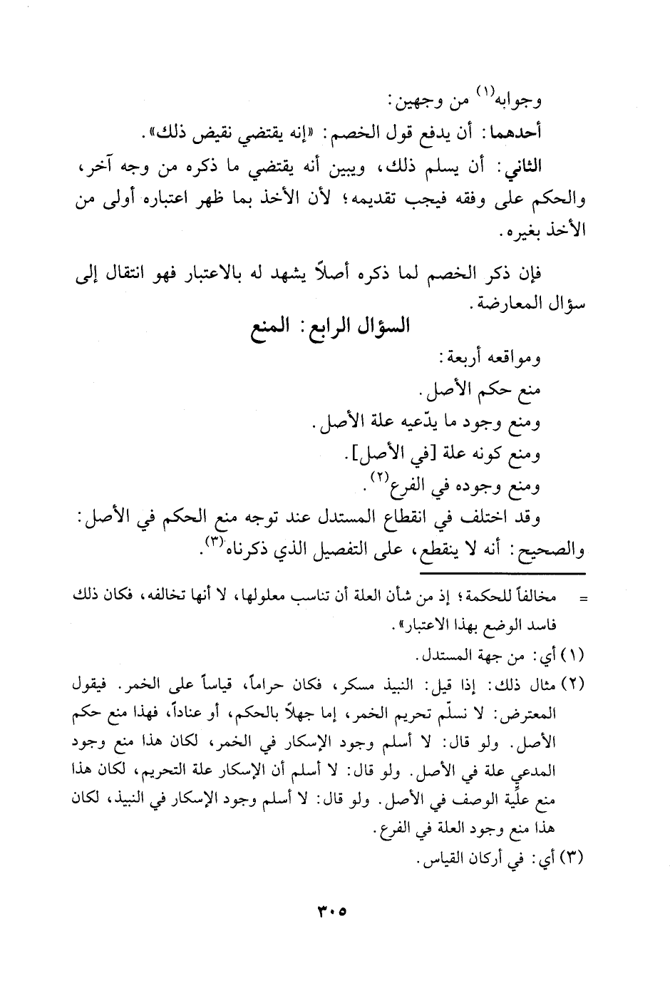 2 مثال ذلك: إذا قيل: النبيد مسكر، فكان حرامًا، قياسًا على الخمر. فيقول المعترض: لا نسلم تحريم الخمر، إما جهلًا بالحكم، أو عنادًا فهذا منع حكم الأصل. ولو قال: لا أسلم وجود الإسكار في الخمر، لكان هذا منع وجود المدعى علة في الأصل. ولو قال: لا أسلم أن الإسكار علة التحريم لكان هذا مع علية الوصف في الأصل. ولو قال: لا أسلم وجود الإسكار في النبيذ، لكان هذا منع وجود العلة في الفرع.