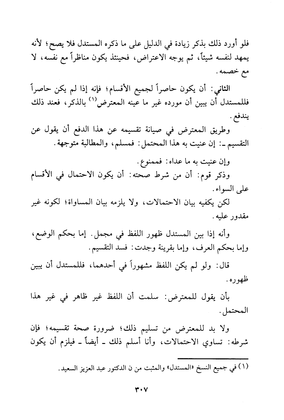 ولا بد للمعترض من تسليم ذلك، ضرورة صحة تقسيمه، فإن شرطه: تساوي الاحتمالات، وأنا أسلم ذلك، أيضًا فيلزم أن يكون