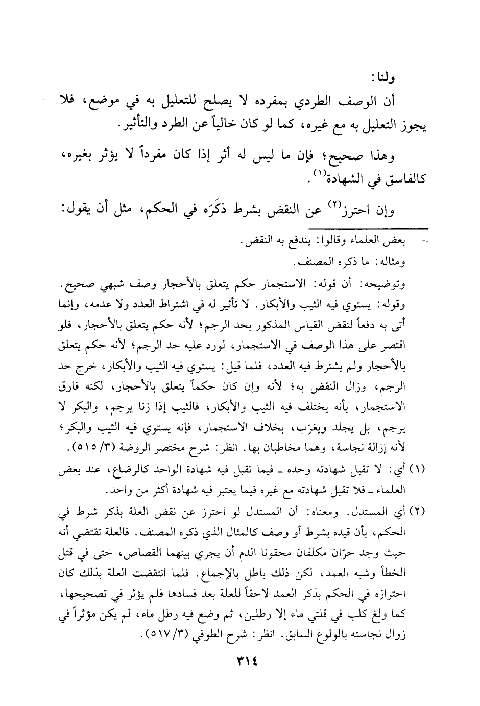 وتوضيحه: أن قوله: الاستجمار حكم يتعلق بالأحجار وصف شبهي صحيح وقوله: يستوي فيه الثيب والأبكار. لا تأثير له في اشتراط العدد ولا عدمه، وإنما أتي به دفعًا لنقض القياس المذكور بحد الرجم؛ لأنه حكم يتعلق بالأحجار، فلو اقتصر على هذا الوصف في الاستجمار، لورد عليه حد الرجم؛ لأنه حكم يتعلق بالأحجار، ولم يشترط فيه العدد، فلما قيل: يستوي فيه الثيب والأبكار، خرج حد الرجم، وزال النقض به؛ لأنه وإن كان حكمًا يتعلق بالأحجار، لكنه فارق الاستجمار، بأنه يختلف فيه الثيب والأبكار، فالثيب إذا زنا يرجم، والبكر لا يرجم، بل يجلد ويغرّب، بخلاف الاستجمار، فإنه يستوي فيه الثيب والبكر؛ لأنه إزالة نجاسة، وهما مخاطبان بها. انظر: شرح مختصر الروضة "3/ 515".