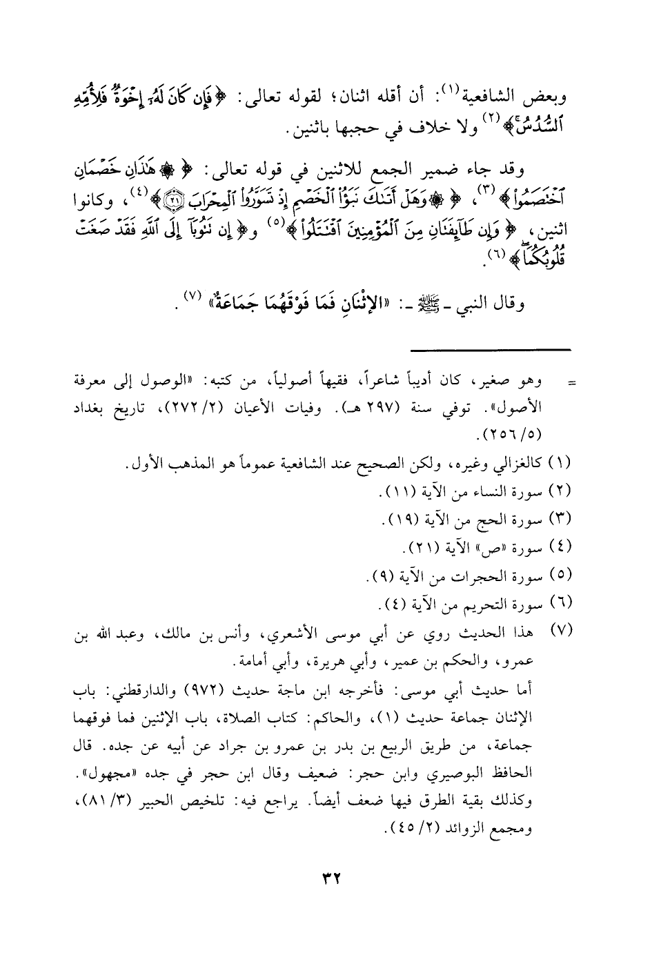 وبعض الشافعية1: أن أقله اثنان، لقوله تعالى: {فَإِنْ كَانَ لَهُ إِخْوَةٌ فَلِأُمِّهِ السُّدُس} 2 ولا خلاف في حجبها باثنين.