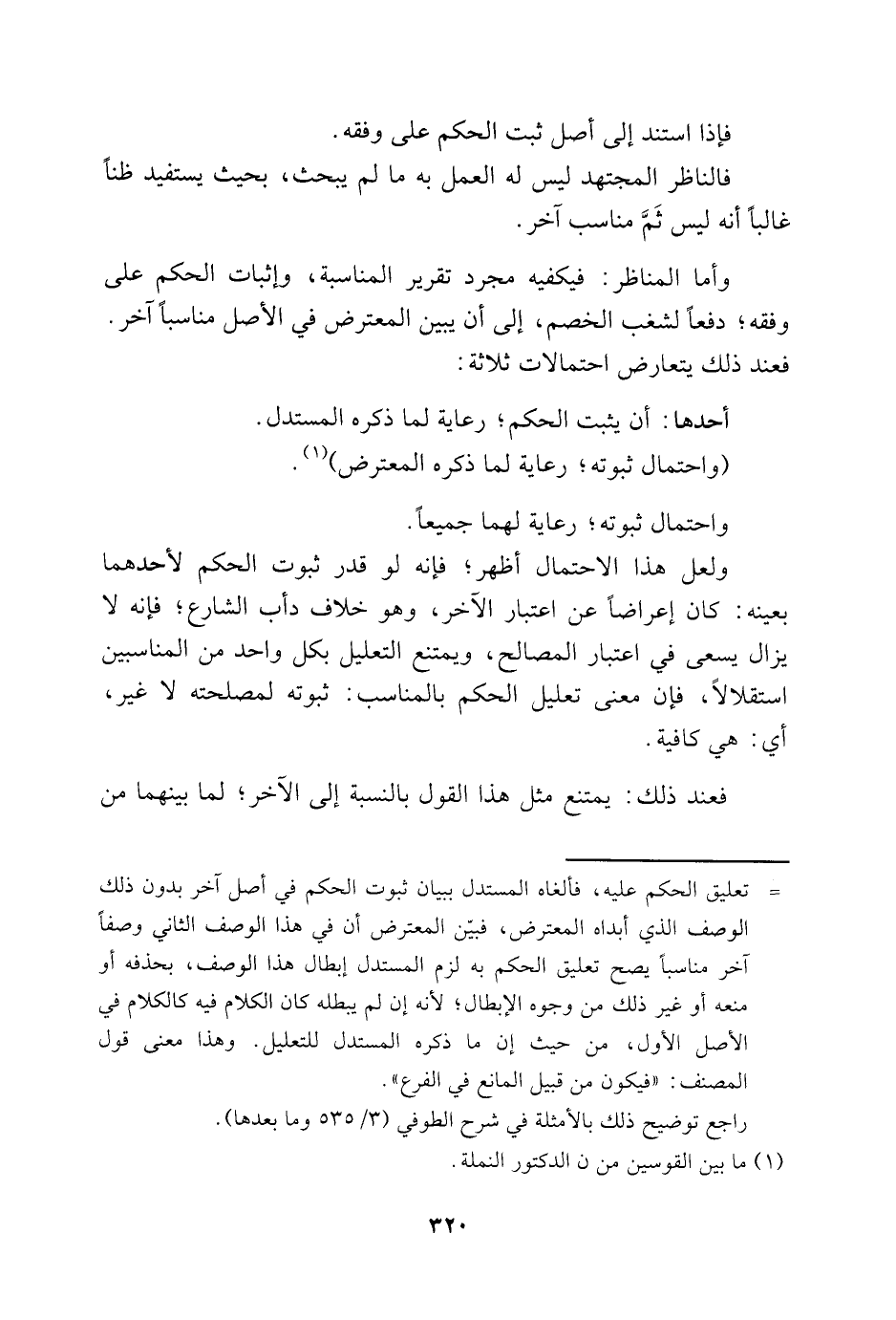 وأما المناظر: فيكفيه مجرد تقرير المناسبة، وإثبات الحكم على وفقه، دفعًا لشغب الخصم، إلى أن يبين المعترض في الأصل مناسبًا آخر، فعند ذلك يتعارض احتمالات ثلاثة: