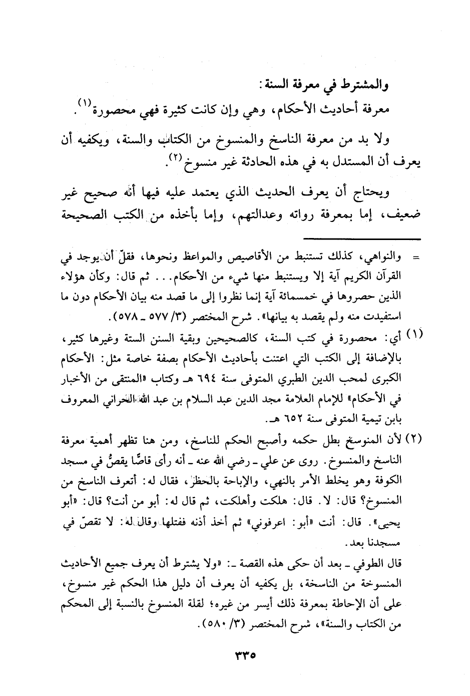 قال الطوفي- بعد أن حكى هذه القصة: "ولا يشترط أن يعرف جميع الأحاديث المنسوخة من الناسخة، بل يكفيه أن يعرف أن دليل هذا الحكم غير منسوخ، على أن الإحاطة بمعرفة ذلك أيسر من غيره؛ لقلة المنسوخ بالنسبة إلى المحكم من الكتاب والسنة"، شرح المختصر "3/ 580".