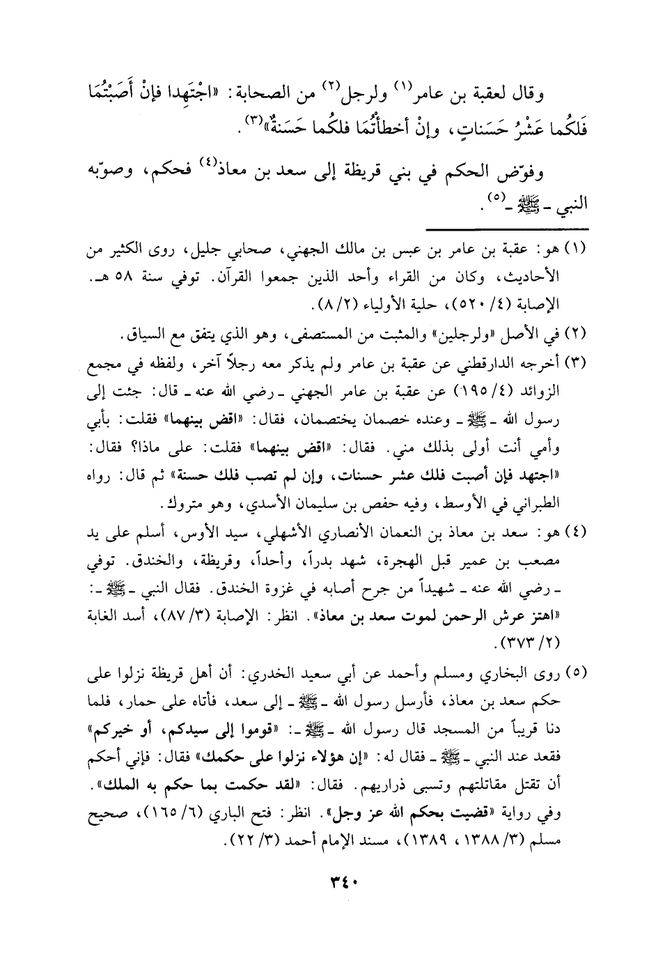 5 روى البخاري ومسلم وأحمد عن أبي سعيد الخدري: أن أهل قريظة نزلوا على حكم سعد بن معاذ، فأرسل رسول الله -صَلَّى اللَّهُ عَلَيْهِ وَسَلَّم- إلى سعد، فأتاه على حمار، فلما دنا قريبًا من المسجد قال رسول الله -صَلَّى اللَّهُ عَلَيْهِ وَسَلَّم: "قوموا إلى سيدكم، أو خيركم" فقعد عند النبي -صَلَّى اللَّهُ عَلَيْهِ وَسَلَّم- فقال له: "إن هؤلاء نزلوا على حكمك" فقال: فإني أحكم أن تقتل مقاتلتهم وتسبي ذراريهم فقال: "لقد حكمت بما حكم به الملك".