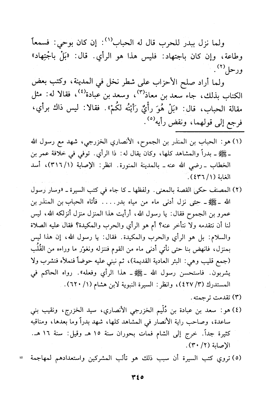 2 المصنف حكى القصة بالمعنى. ولفظها- كما جاء في كتب السيرة – وسار رسول الله -صَلَّى اللَّهُ عَلَيْهِ وَسَلَّم-حتى نزل أدنى ماء من مياه بدر..... فأتاه الحباب بن المنذر بن عمرو بن الجموح فقال: يا رسول الله، أرأيت هذا المنزل منزلًا أنزلكه الله، ليس لنا أن نتقدمه ولا نتأخر عنه؟ أم هو الرأي والحرب والمكيدة؟ فقال -عليه الصلاة والسلام: بل هو الرأي والحرب والمكيدة. فقال يا رسول الله، إن هذا ليس بمنزل، فانهض بنا حتى نأتي أدنى ماء من القوم فننزله ونغوِّر ما وراءه من القُلُب "جمع قليب وهي: البئر العادية القديمة" ثم نبني عليه حوضًا فنملأه فنشرب ولا يشربون. فاستحسن رسول الله -صَلَّى اللَّهُ عَلَيْهِ وَسَلَّم-هذا الرأي وفعله". رواه الحاكم في المستدرك "3/ 427"، وانظر: السيرة النبوية لابن هشام "1/ 620".