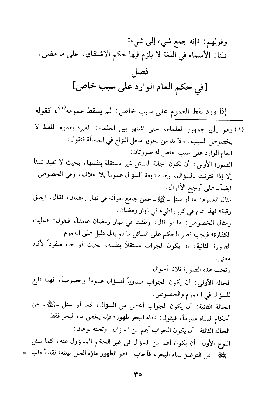 1 وهو رأي جمهور العلماء، حتى اشتهر بين العلماء: العبرة بعموم اللفظ لا بخصوص السبب، ولا بد من تحرير محل النزاع في المسألة فنقول: العام الوارد على سبب خاص له صورتان.