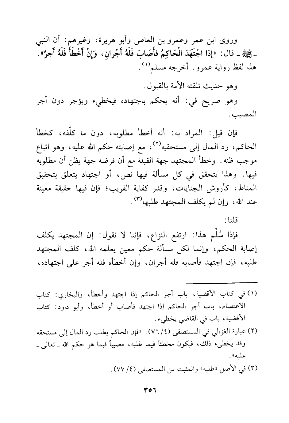2 عبارة الغزالي في المستصفى "4/ 76": "فإن الحاكم يطلب ردّ المال إلى مستحقه وقد يخطئ ذلك، فيكون مخطئًا فيما طلبه، مصيبًا فيما هو حكم الله – تعالى- عليه".