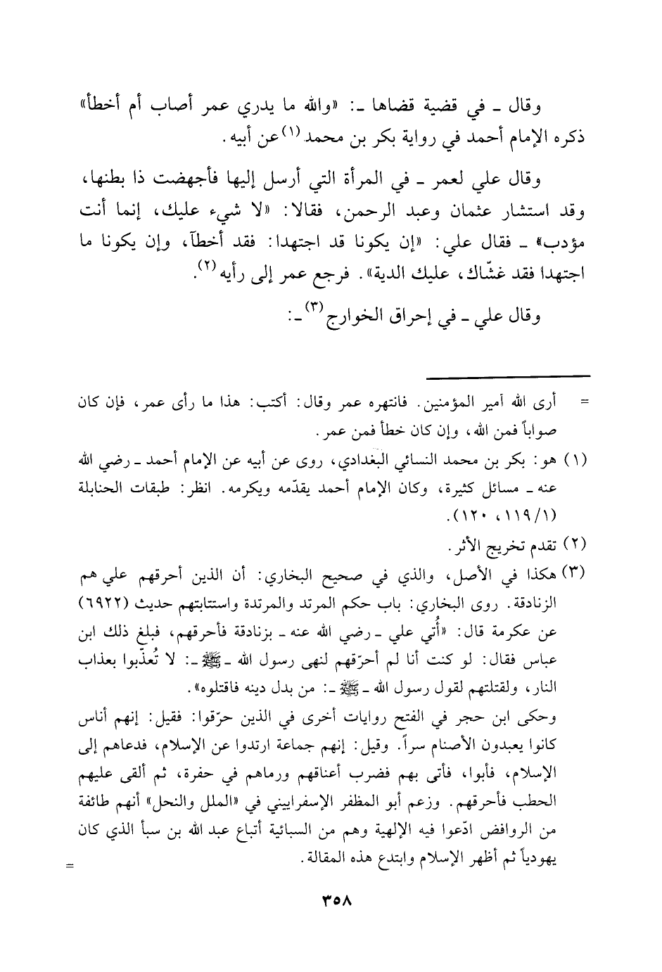 3 هكذا في الأصل، والذي في صحيح البخاري: أن الذين أحرقهم علي هم الزنادقة. روى البخارى: باب حكم المرتد والمرتدة واستتابتهم حديث "6922" عن عكرمة قال: "أُتِيَ علي– رَضِيَ اللَّهُ عَنْهُ- بزنادقة فأحرقهم، فبلغ ذلك ابنعباس، فقال: لو كنت أنا لم أحرقهم لنهي رسول الله -صَلَّى اللَّهُ عَلَيْهِ وَسَلَّم: لا تعذبوا بعذاب النار، ولقتلتهم لقول رسول الله -صَلَّى اللَّهُ عَلَيْهِ وَسَلَّم: "من بدل دينه فاقتلوه".