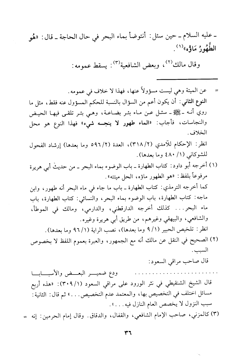 -عليه السلام- حين سئل: أنتوضأ بماء البحر في حال الحاجة؟ قال: "هُو الطَّهُورُ مَاؤُه" 1.