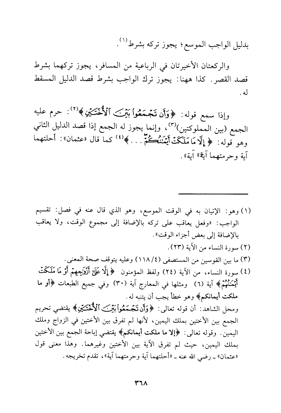 ومحل الشاهد: أن قوله تعالى: {وَأَنْ تَجْمَعُوا بَيْنَ الْأُخْتَيْنِ} يقتضي تحريم الجمع بين الأختين بملك اليمين؛ لأنها لم تفرق بين الأختين في الزواج وملك اليمين. وقوله تعالى: {إِلَّا مَا مَلَكَتْ أَيْمَانُكُمْ} يقتضي إباحة الجمع بين الأختين بملك اليمين؛ حيث لم تفرق الآية بين الأختين وغيرهما. وهذا معنى قول "عثمان"- رَضِيَ اللَّهُ عَنْهُ: "أحلتهما آية وحرمتهما آية"، تقدم تخريجه.