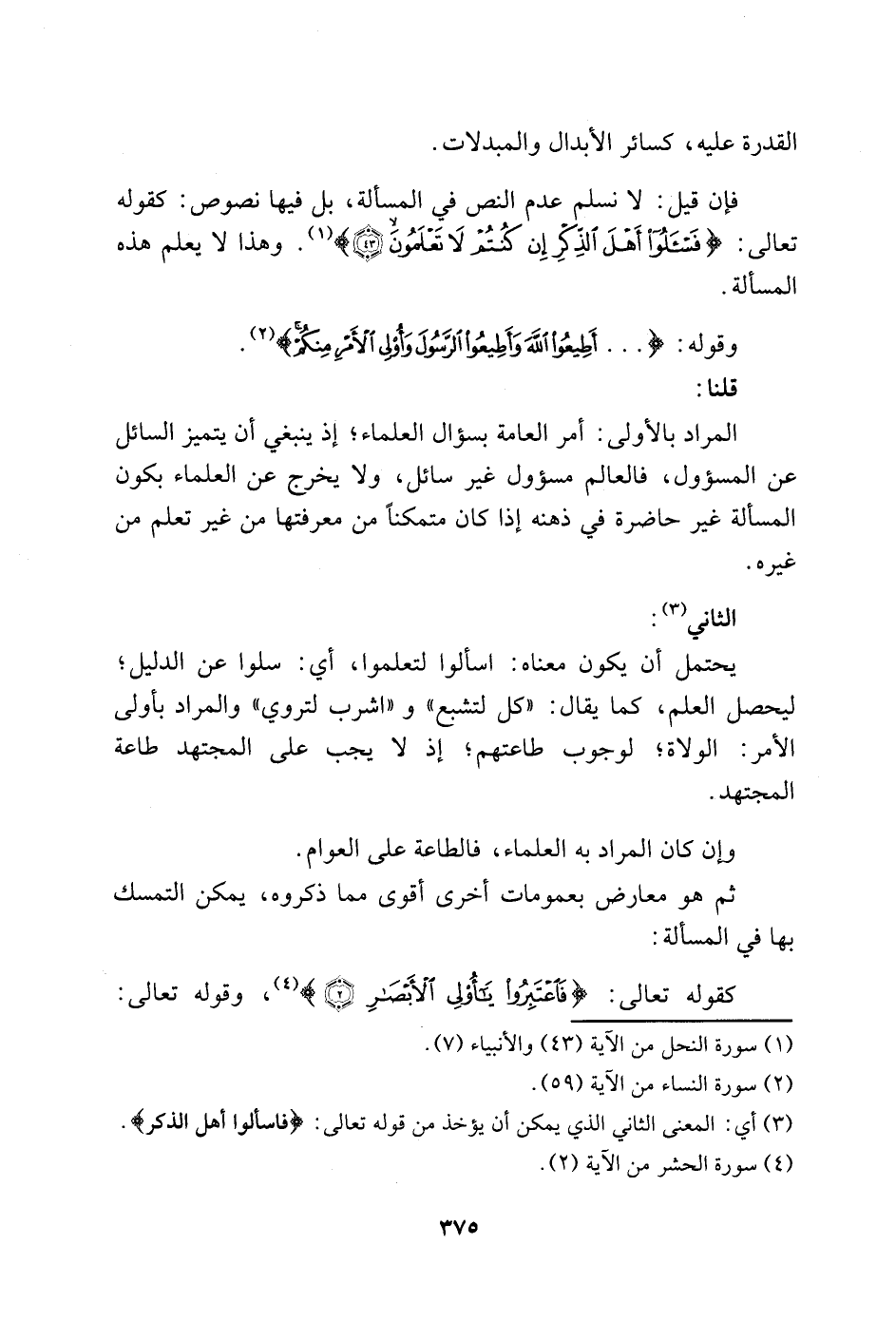 يحتمل أن يكون معناه: اسألوا لتعلموا، أي: سلوا عن الدليل ليحصل العلم، كما يقال: "كُلْ لتشبع" و"اشرب لتروي" والمراد بـ {أُولِي الْأَمْرِ} : الولاة، لوجوب طاعاتهم؛ إذ لا يجب على المجتهد طاعة المجتهد.