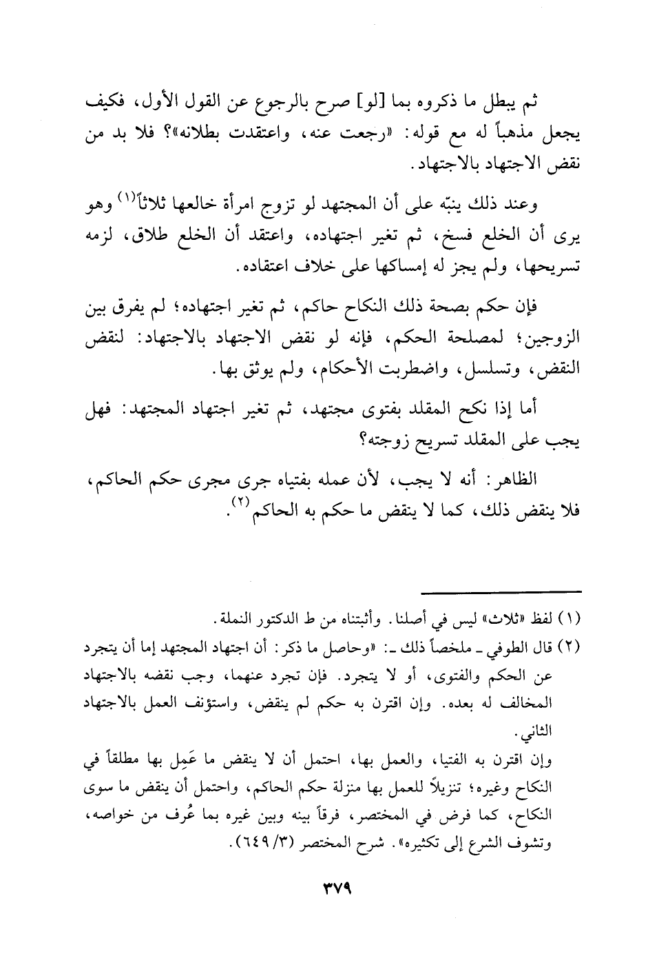 2 قال الطوفي- ملخصا ذلك: "وحاصل ما ذكر: أن اجتهاد المجتهد إما أن يتجرد عن الحكم والفتوى، أو لا يتجرد. فإن تجرد عنهما: وجب نقضه بالاجتهاد المخالف له بعده. وإن اقترن به حكم: لم ينقض، واستؤنف العمل بالاجتهاد الثاني.