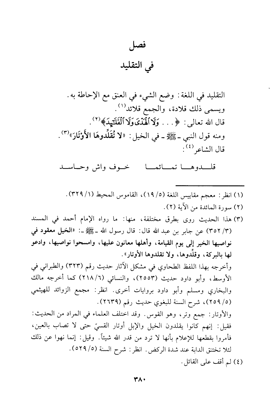 ومنه قول النبي -صَلَّى اللَّهُ عَلَيْهِ وَسَلَّم- في الخيل: "لا تقلِّدوها الأوتار"3.