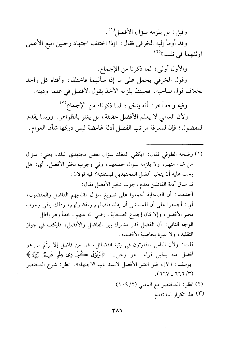 قلت: ولأن الناس متفاوتون في رتبة الفضائل فما من فاضل إلا وثَمَّ من هو أفضل منه بدليل قوله – عَزَّ وَجَلََََّّّّ: {وَفَوْقَ كُلِّ ذِي عِلْمٍ عَلِيمٌ} [يوسف: من الآية: 76] ، فلو اعتبر الأفضل لانسد باب الاجتهاد". انظر: شرح المختصر "3/ 666-367".