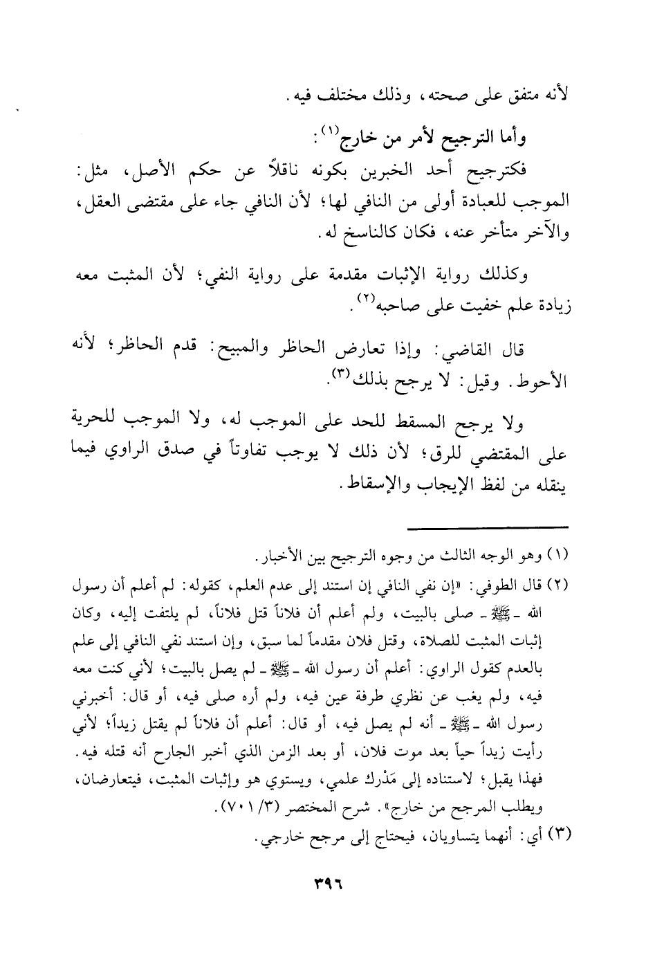 2 قال الطوفي: "إن نفي النافي إن استند إلى عدم العلم، كقوله: لم أعلم أن رسول الله -صَلَّى اللَّهُ عَلَيْهِ وَسَلَّم- صلّى بالبيت، ولم أعلم أن فلانًا قتل فلانًا، لم يلتفت إليه، وكان إثبات المثبت للصلاة، وقتل فلان مقدمًا لما سبق، وإن استند نفي النافي إلى علم بالعدم كقول الراوي: أعلم أن رسول الله -صَلَّى اللَّهُ عَلَيْهِ وَسَلَّم- لم يصلِّ بالبيت؛ لأني كنت معه فيه، ولم يغب عن نظري طرفة عين فيه، ولم أره صلّى فيه، أو قال: أخبرني رسول الله -صَلَّى اللَّهُ عَلَيْهِ وَسَلَّم- أنه لم يصلِّ فيه، أو قال: أعلم أن فلانًا لم يقتل زيدًا؛ لأني رأيت زيدًا حيًّا بعد موت فلان، أو بعد الزمن الذي أخبر الجارح أنه قتله فيه. فهذا يقبل؛ لاستناده إلى مَدْرك علمي، ويستوي هو وإثبات المثبت، فيتعارضان، ويطلب المرجح من خارج". شرح المختصر "3/ 701".