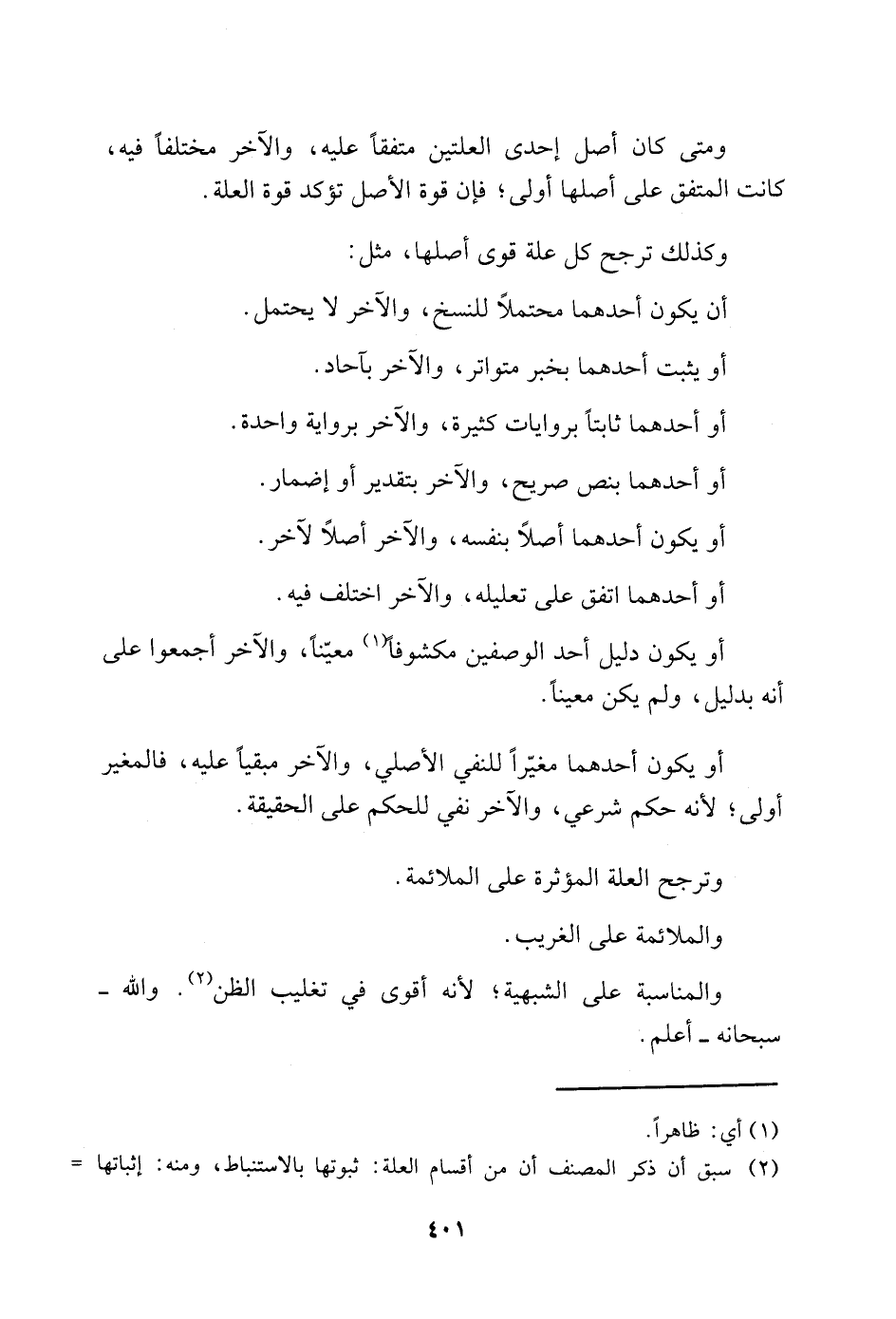 ومتى كان أصل إحدى العلتين متفقًا عليه، والآخر مختلفًا فيه، كانت المتفق على أصلها أولى، فإن قوة الأصل تؤكد قوة العلة.
