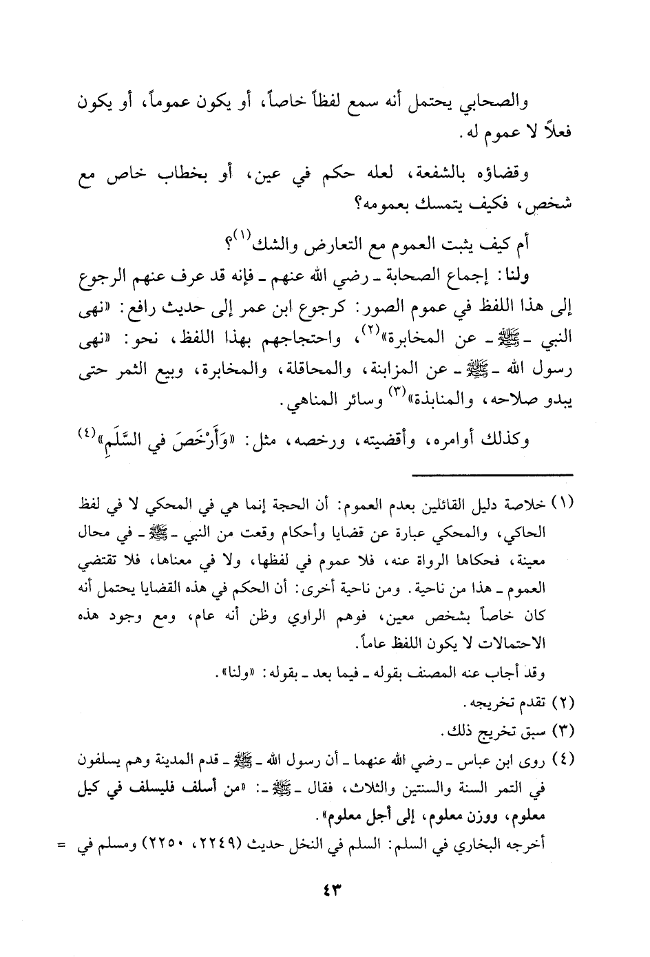 1 خلاصة دليل القائلين بعدم العموم: أن الحجة إنما هي في المحكى لا في لفظ الحاكي، والمحكي عبارة عن قضايا وأحكام وقعت من النبي -صلى الله عليه وسلم- في محال معينة، فحكاها الرواة عنه، فلا عموم في لفظها، ولا في معناها، فلا تقتضي العموم، هذا من ناحية. ومن ناحية أخرى: أن الحكم في هذه القضايا يحتمل أنه كان خاصًّا بشخص معين، فوهم الراوي وظن أنه عام، ومع وجود هذه الاحتمالات لا يكون اللفظ عامًّا.