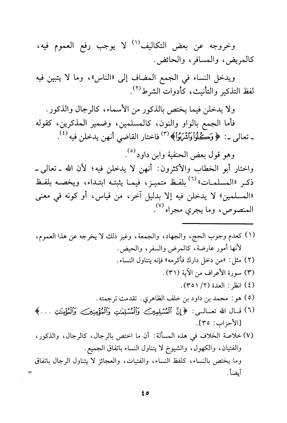 واختار أبو الخطاب والأكثرون: أنهن لا يدخلن فيه، لأن الله -تعالى- ذكر "المسلمات"6 بلفظ متميز، فيما يثبته ابتداء، ويخصه بلفظ "المسلمين" لا يدخلن فيه إلا بدليل آخر، من قياس، أو كونه في معنى المنصوص، وما يجري مجراه7.