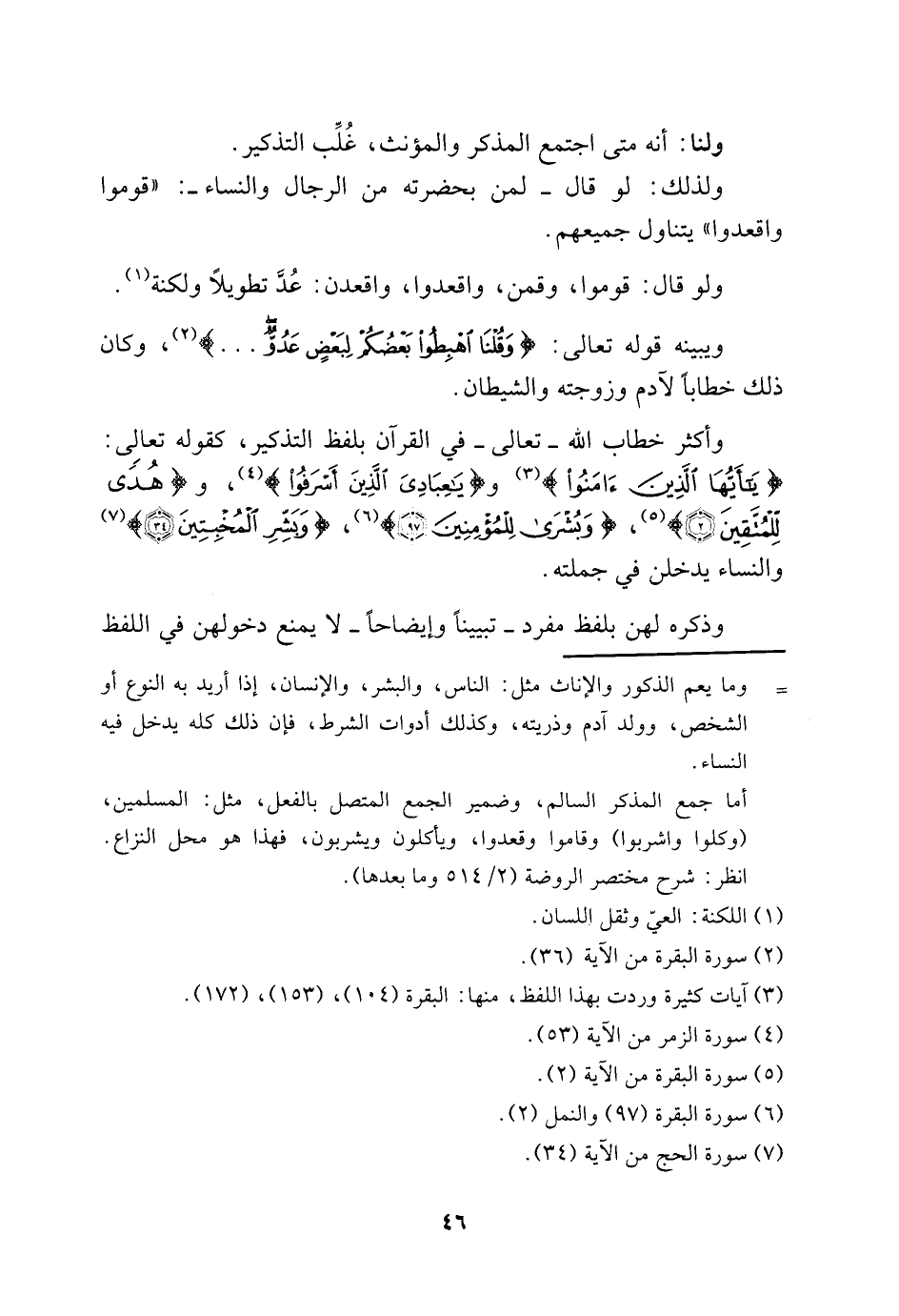 وأكثر خطاب الله -تعالى- في القرآن بلفظ التذكير، كقوله تعالى: {يَا أَيُّهَا الَّذِينَ آمَنُوا} 3 و {يَا عِبَادِيَ الَّذِينَ أَسْرَفُوا} 4، و {هُدىً لِلْمُتَّقِين} 5، {وَبُشْرَى لِلْمُؤْمِنِين} 6، {وَبَشِّرِ الْمُخْبِتِين} 7 والنساء يدخلن في جملته.