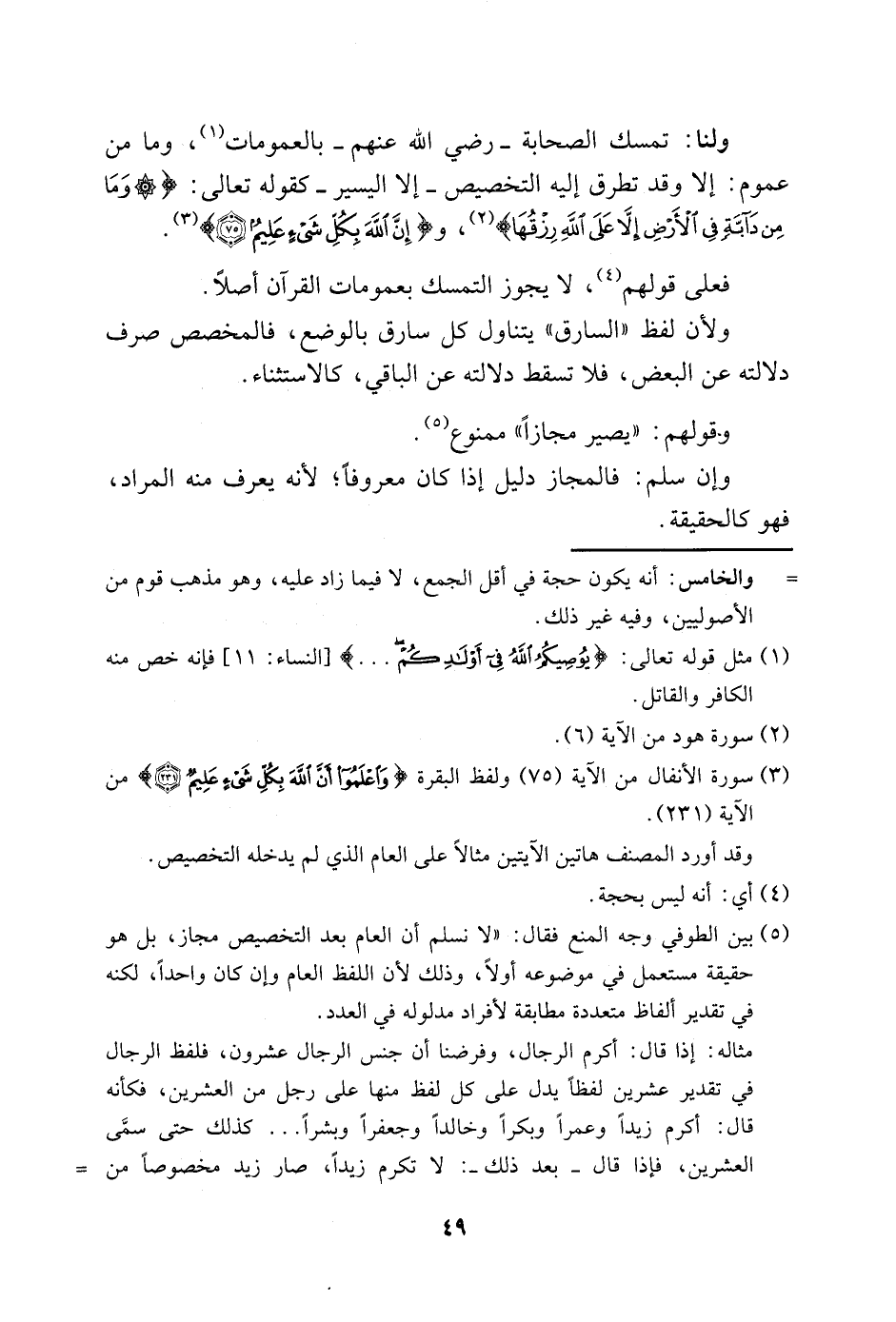 5 بين الطوفي وجه المنع فقال: "لا نسلم أن العام بعد التخصيص مجاز، بل هو حقيقة مستعمل في موضوعه أولًا، وذلك لأن اللفظ العام وإن كان واحدًا، لكنه في تقدير ألفاظ متعددة مطابقة لأفراد مدلوله في العدد.