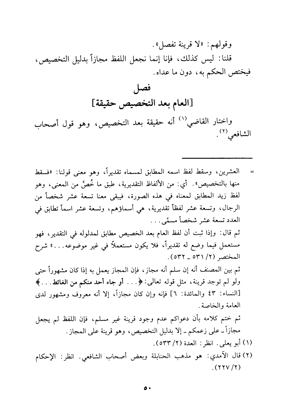 واختار القاضي1 أنه حقيقة بعد التخصيص، وهو قول أصحاب الشافعي2.
