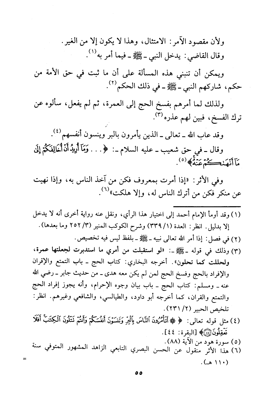 3 وذلك في قوله، صَلّى الله عَلَيْهِ وَسَلّم: "لو استقبلت من أمري ما أستدبرت لجعلتها عمرة، ولحللت كما تحلون". أخرجه البخاري: كتاب الحج، باب التمتع والإقران والإفراد بالحج وفسخ الحج لمن لم يكن معه هدى، من حديث جابر -رضي الله عنه- ومسلم: كتاب الحج، باب بيان وجوه الإحرام، وأنه يجوز إفراد الحج والتمتع والقران، كما أخرجه أبو داود، والطيالسي، والشافعي وغيرهم. انظر: تلخيص الحبير "2/ 231".