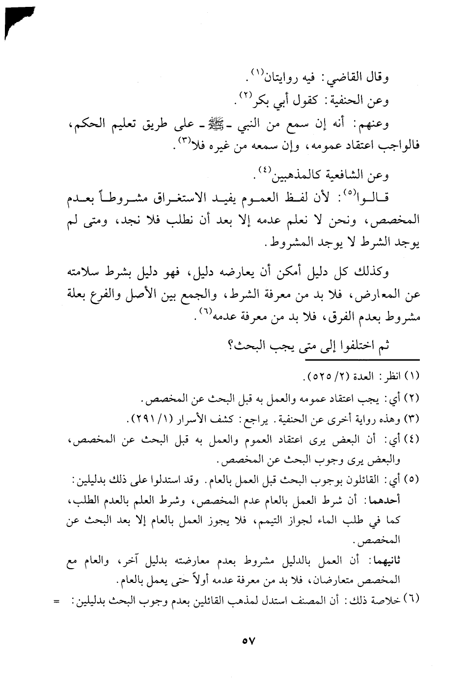 5 أي: القائلون بوجوب البحث قبل العمل بالعام. وقد استدلوا على ذلك بدليلين: أحدهما: أن شرط العمل بالعام عدم المخصص، وشرط العلم بالعدم الطلب، كما في طلب الماء لجواز التيمم، فلا يجوز العمل بالعام إلا بعد البحث عن المخصص.