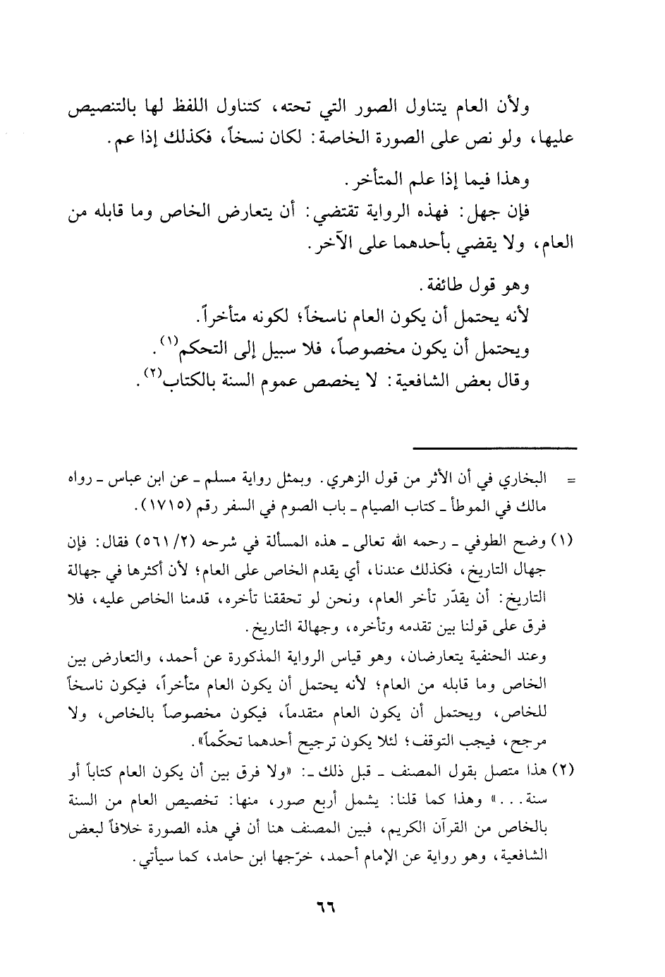 1 وضح الطوفي -رحمه الله تعالى- هذه المسألة في شرحه "2/ 561" فقال: فإن جهال التاريخ، فكذلك عندنا، أي: يقدم الخاص على العام؛ لأن أكثرها في جهالة التاريخ: أن يقدر تأخر العام، ونحن لو تحققنا تأخره، قدمنا الخاص عليه، فلا فرق على قولنا بين تقدمه وتأخره، وجهالة التاريخ.