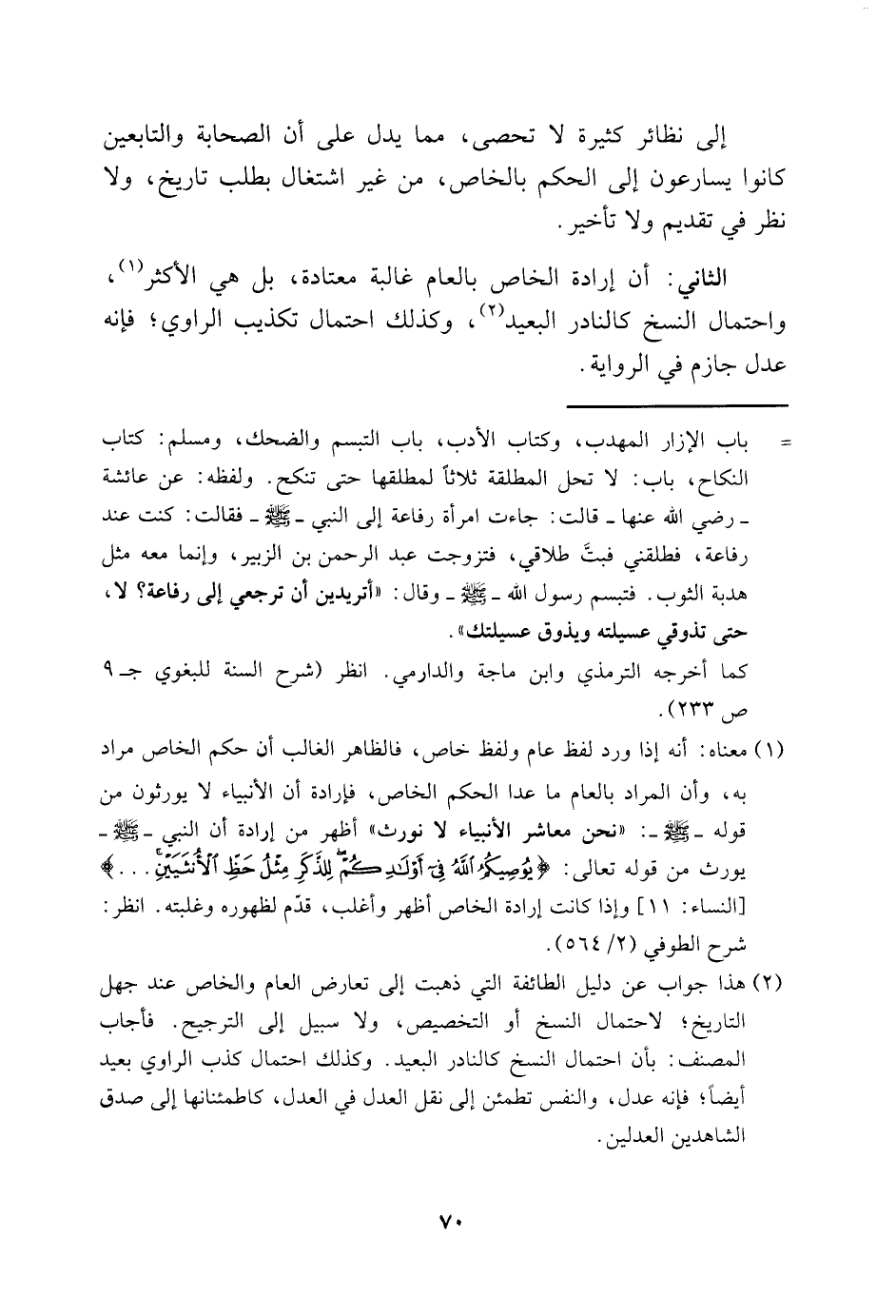 إلى نظائر كثيرة لا تحصى، مما يدل على أن الصحابة والتابعين كانوا يسارعون إلى الحكم بالخاص، من غير اشتغال بطلب تاريخ، ولا نظر في تقديم ولا تأخير.