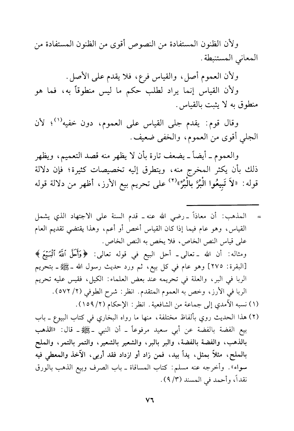 ولأن الظنون المستفادة من النصوص أقوى من الظنون المستفادة من المعاني المستنبطة.