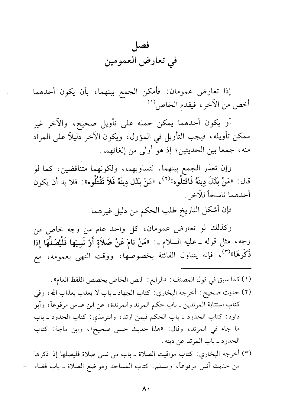 وكذلك لو تعارض عمومان، كل واحد عام من وجه خاص من وجه، مثل قوله، عليه السلام: "مَنْ نَامَ عَنْ صَلَاةٍ أَوْ نَسِيَها فَلْيُصَلِّهَا إِذَا ذَكَرَهَا" 3، فإنه يتناول الفائتة بخصوصها، ووقت النهي بعمومه، مع