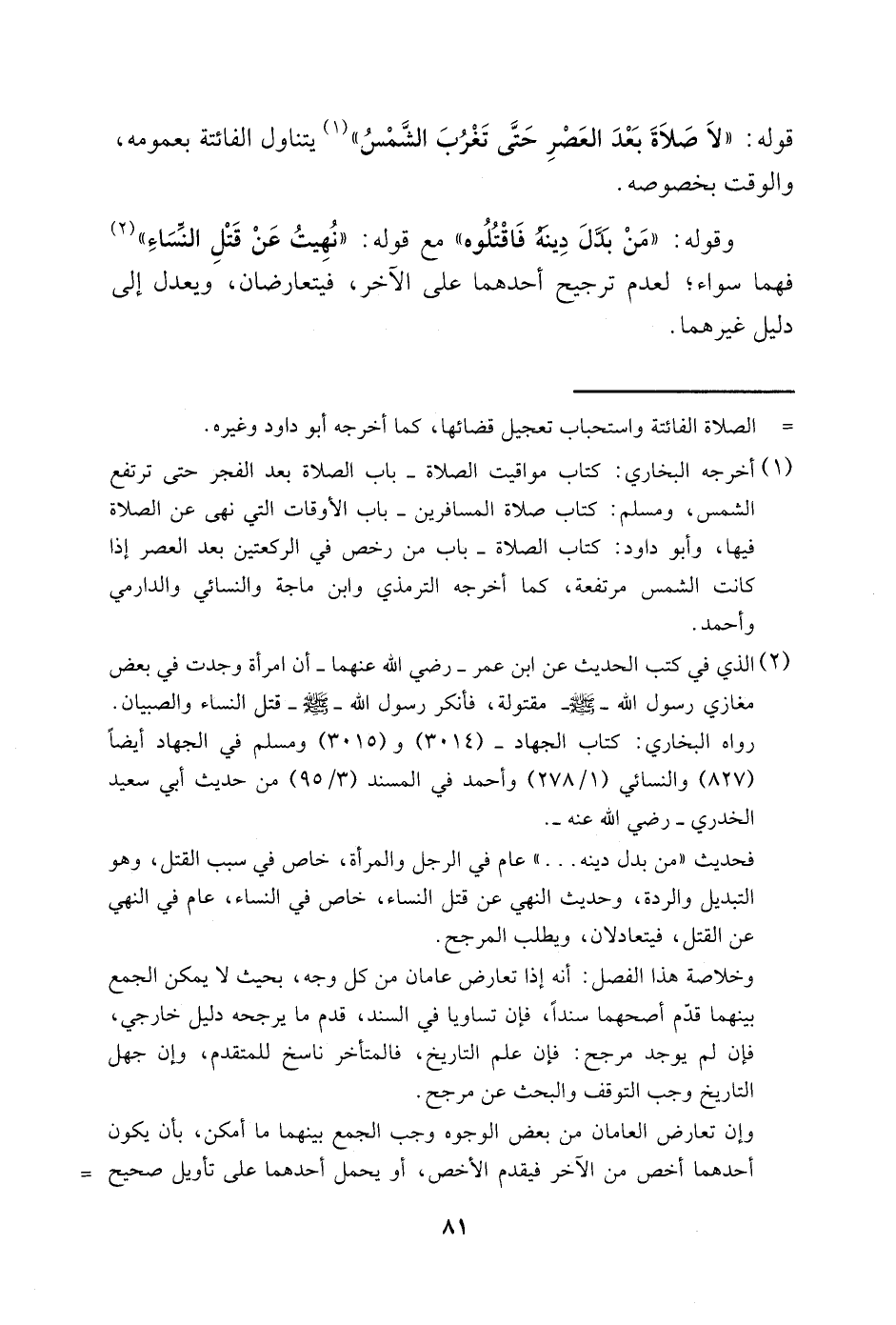 وقوله: "مَنْ بَدَّلَ دِينَهُ فَاقْتُلُوه" مع قوله: "نُهِيتُ عَنْ قَتْلِ النِّسَاءِ" 2.