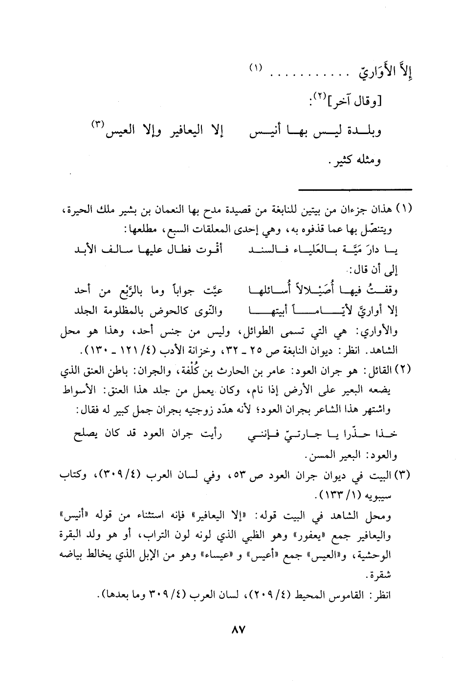 ومحل الشاهد في البيت قوله: "إلا اليعافير" فإنه استثناء من قوله: "أنيس" واليعافير جمع "يعفور" وهو الظبي الذي لونه لون التراب، أو هو ولد البقرة الوحشية، و"العيس" جمع "أعيس" و"عيساء" وهو من الإبل الذي يخالط بياضه شقرة.