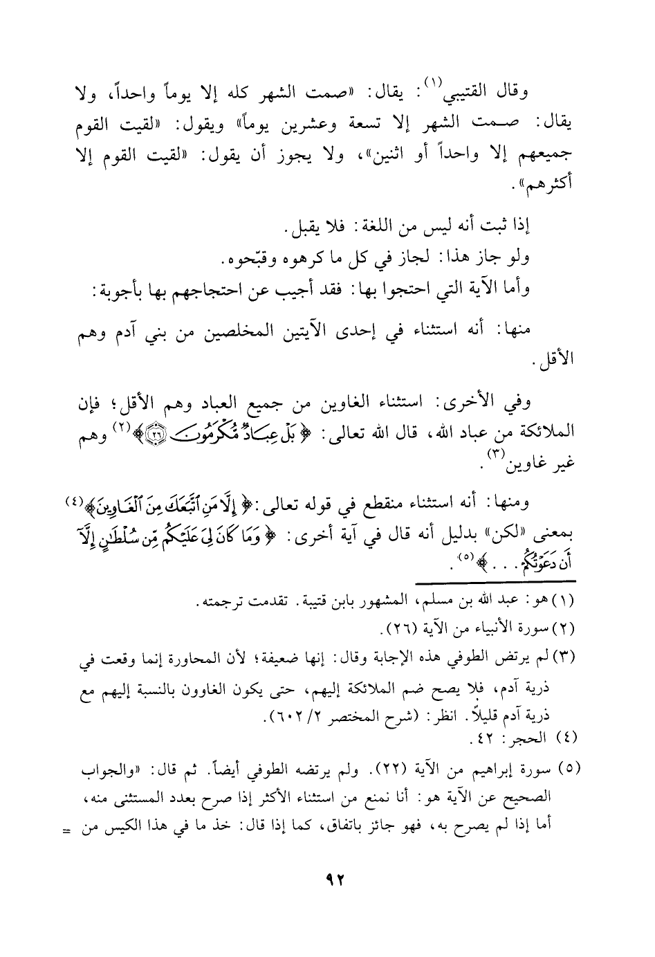 وقال القتيبي1: يقال: "صمت الشهر كله إلا يومًا واحدًا، ولا يقال: صمت الشهر إلا تسعة وعشرين يومًا" ويقول: "لقيت القوم جميعهم إلا واحدًا أو اثنين"، ولا يجوز أن يقول: "لقيت القوم إلا أكثرهم".