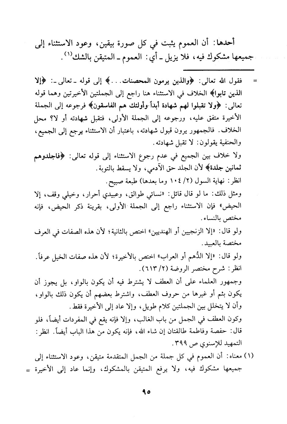1 معناه: أن العموم في كل جملة من الجمل المتقدمة متيقن، وعود الاستثناء جميعها مشكوك فيها، ولا يرفع المتيقن بالمشكوك، وإنما عاد إلى الأخيرة =