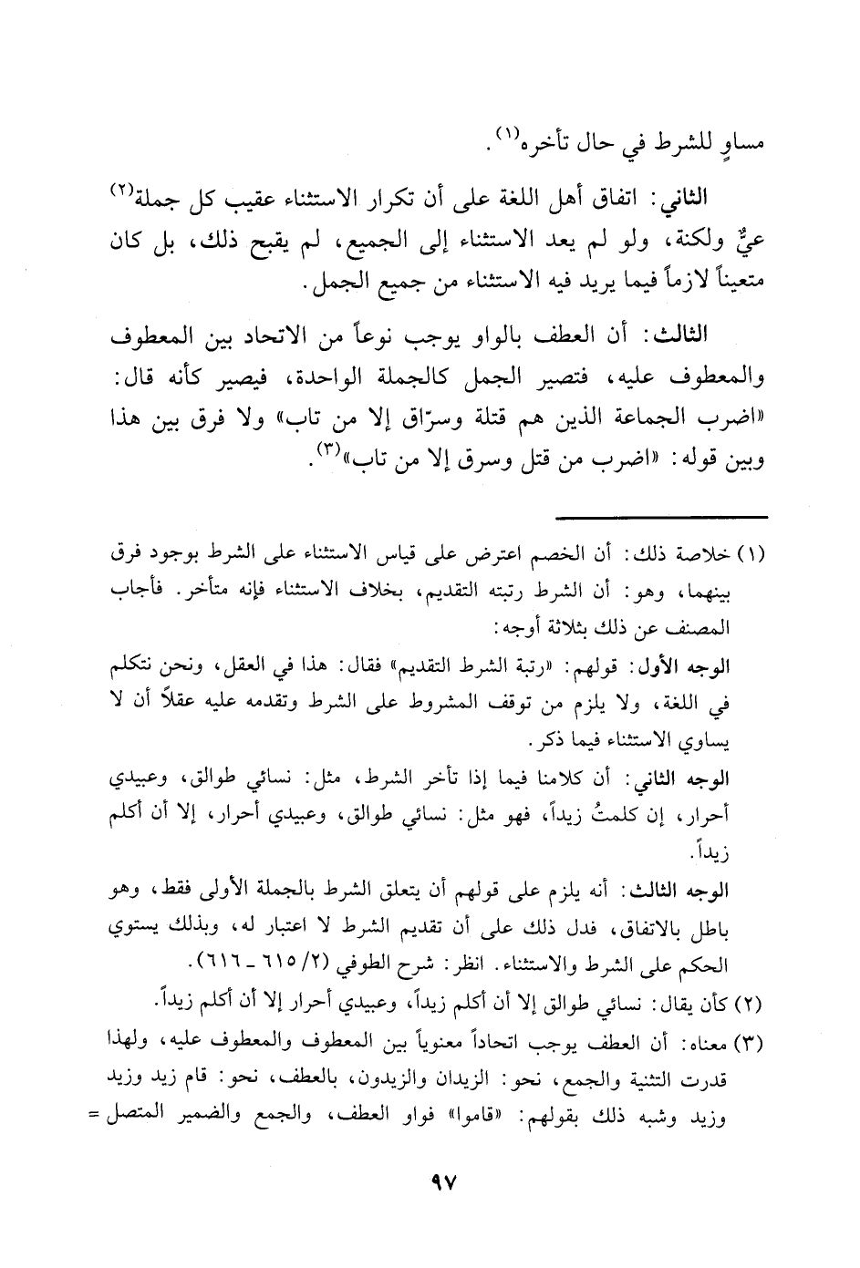 الوجه الثالث: أنه يلزم على قولهم أن يتعلق الشرط بالجملة الأولى فقط، وهو باطل بالاتفاق، فدل ذلك على أن تقديم الشرط لا اعتبار له، وبذلك يستوي الحكم على الشرط والاستثناء. انظر: شرح الطوفي "2/ 615-616".