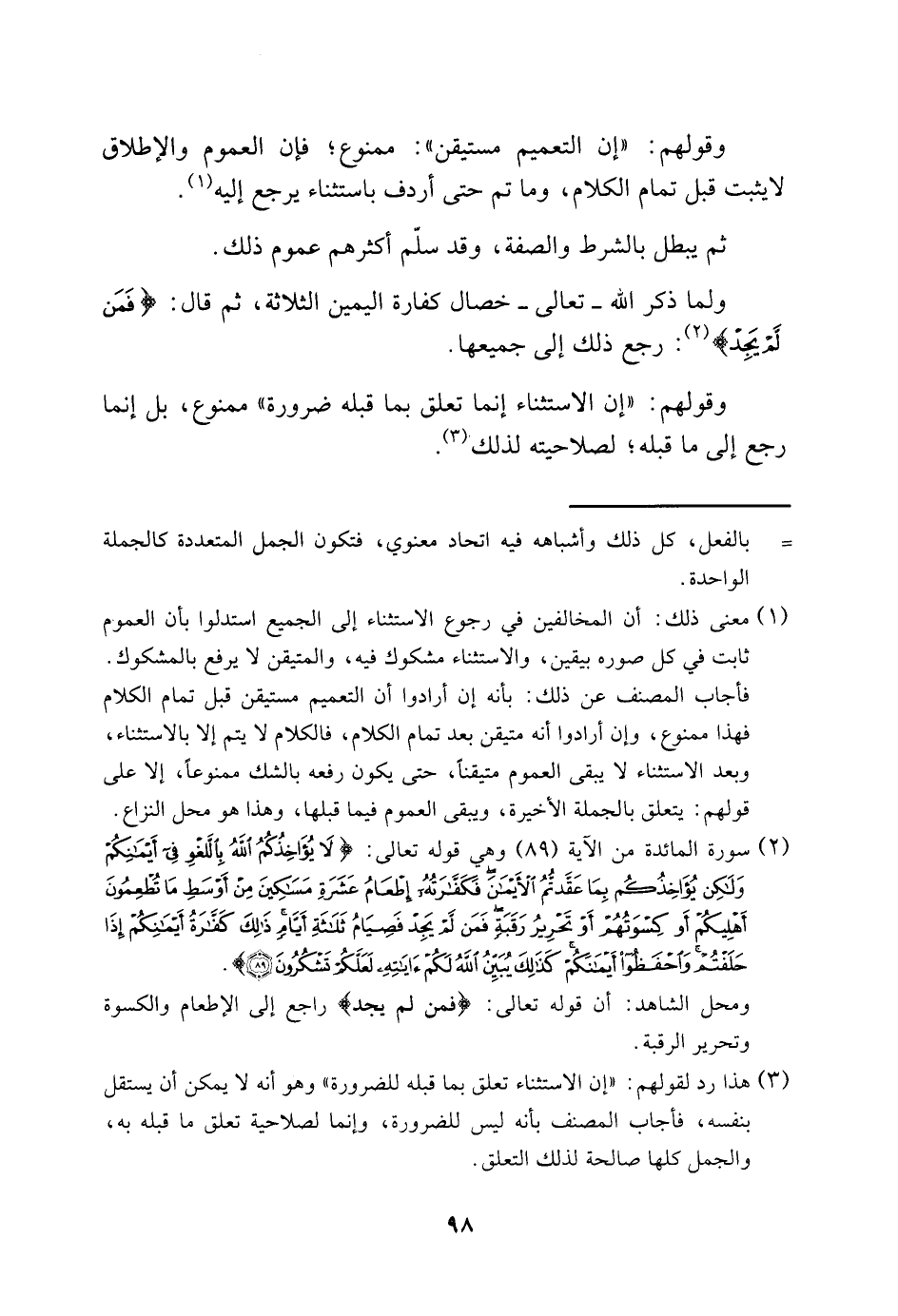 1 معنى ذلك: أن المخالفين في رجوع الاستثناء إلى الجميع استدلوا بأن العموم ثابت في كل صورة بيقين، والاستثناء مشكوك فيه، والمتيقن لا يرفع المشكوك فأجاب المصنف عن ذلك: بأنه إن أرادوا أن التعميم مستيقن قبل تمام الكلام فهذا ممنوع، وإن أرادوا أنه متيقن بعد تمام الكلام، فالكلام لا يتم إلا بالاستثناء، وبعد الاستثناء لا يبقى العموم متيقنًا، حتى يكون رفعه بالشك ممنوعًا، إلا على قولهم: يتعلق بالجملة الأخيرة، ويبقى العموم فيما قبلها، وهذا هو محل النزاع.