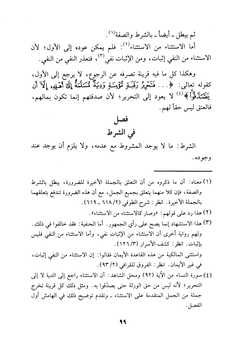 1 معناه: أن ما ذكروه من أن التعلق بالجملة الأخيرة للضرورة، يبطل بالشرط والصفة، فإن كلًّا منهما يتعلق بجميع الجمل، مع أن هذه الضرورة تندفع بتعلقهما بالجملة الأخيرة. انظر: شرح الطوفي "2/ 618-619".