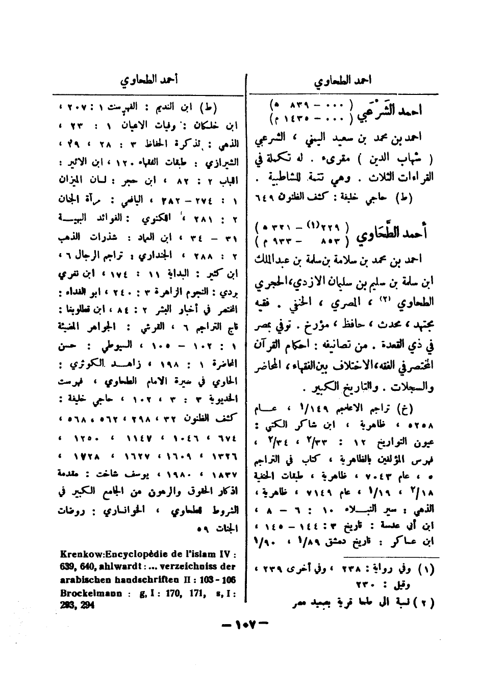 (ط) حاجي خليفة: كشف الظنون 649 أحمد الطحاوي (229 (1) - 321 هـ) (853 - 933 م) احمد بن محمد بن سلامة بن سلمة بن عبد الملك ابن سلمة بن سليم بن سليمان الازدي، الحجري الطحاوي (2) ، المصري، الحنفي.