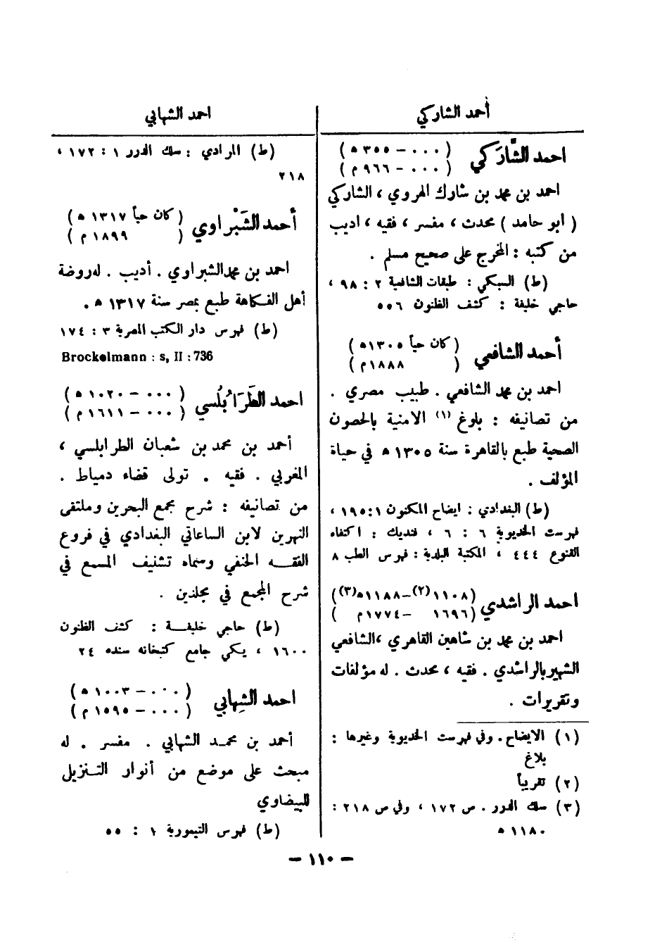 (ط) السبكي: طبقات الشافعية 2: 98، حاجي خليفة: كشف الظنون 556 أحمد الشافعي (كان حيا 1305 هـ) (1888 م) احمد بن محمد الشافعي.