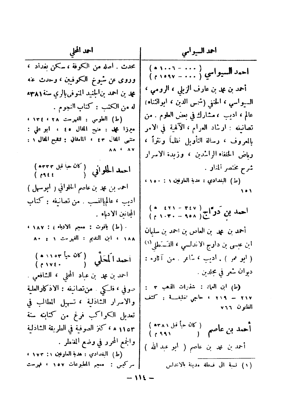 من تصانيفه: كتاب المجانين الادباء (ط) ياقوت: معجم الادباء 4: 187، 188، ابن النديم: الفهرست 1: 80 احمد المحلي: (كان حيا 1153 هـ) (1740 م) احمد بن محمد بن عباد المحلي، الشافعي، صوفي، فلكي من تصانيفه: الاذكار العلية والاسرار الشاذلية، تسهيل المطالب في تعديل الكواكب فرغ من كتابته سنة 1153 هـ، كنز الصوفية في الطريقة الشاذلية والجمع المحرر في وضع المقنطر، (ط) البغدادي: هدية العارفين 1: 173، سر كيس: معجم المطبوعات 157، فهرست